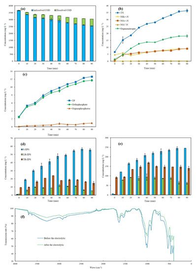 Changes in the concentrations of (a) Different types of chemical oxygen demand (COD), (b) Different types of nitrogen, (c) Different types of phosphorus, (d) Protein, (e) Polysaccharide, and (f) An Fourier transform infrared spectrometer (FTIR) image of sludge extracellular polymeric substances (EPS) level before and after electrolysis.