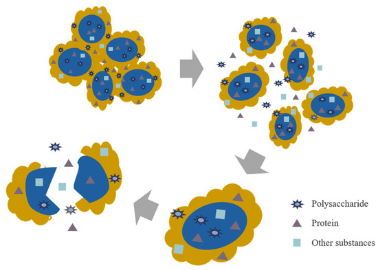 Based on the previously mentioned study on the changes in sludge characteristics in the electrochemical cell lysis process, this process can be illustrated as shown in Figure 7.