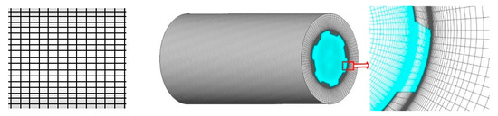 In this study, the structured meshes with high qualities for our computational model are generated by ICEM software. As known from Ref [29,30,31], the mesh size near the wall greatly influence the simulation results. For accurate capturing the heat transfer characteristics of supercritical fluids, only if y+ ≤ 1, can get more reliable result. Therefore, 30 boundary layer grids are set in the near-wall region, and the size of the first layer grid is further adjusted according to the preliminary calculated y+ to make sure the final y+ within the range of 0.1~1. Besides, the heat conduction effect in the solid region have been also considered. The conjugated heat transfers between the solid domain and the fluid domain is solved. To maintain a reasonable gird number, a non-uniform structured grid size was adopted, where the same grid size is used in the transition region to match the interfaces at both sides of the inner wall. Additionally, the mesh independence solution is obtained by successively refining the original mesh. Finally, the total grid number in the whole calculated domain meshes is 9.85 million, and the mesh structure is shown in Figure 3.