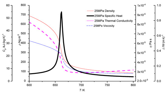 Besides, the properties of supercritical fluid have a significant influence on the flow and heat transfer characteristics due to its special change, especially close to the pseudo-critical temperature, as seen in Figure 4, where the database derived from NIST Refprop [32].
