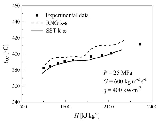 For modelling supercritical fluids, there is still no unified turbulence model due to its complexity turbulent heat transfer lead by steep variation in thermophysical properties. As checked in the previous research, the mostly common turbulence models for supercritical fluids are the RNG k-ε model with enhanced wall treatment [29] and the SST k-ω model [30]. To find out the best model for IRTs at supercritical pressures, both two turbulence models are employed to calculate their flow and heat transfer in the vertically upward IRT. Meanwhile, to verify the accuracy of the simulation model, the corresponding experimental data is also given. Figure 5 shows the calculated wall temperature obtained by numerical simulation and the experimental values of IRTs under a specified condition with mass flux of 600 kg/m2 s and heat flux of 400 kW/m2.