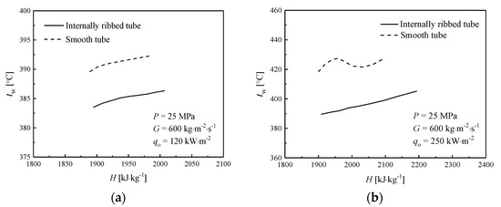 As shown in Figure 6a, at a low heat flux (i.e., q0 = 120 kW·m−2), the averaged inner-wall temperature of ST and IRT increases with the fluid bulk enthalpy, but the inner-wall temperature of IRT seem evidently lower than that in ST by 6~7 °C. When the heat flux increased to a higher value (i.e., q0 = 250 kW·m−2), as shown in Figure 6b, the corresponding averaged inner-wall temperature of ST rapidly rises as the increase of bulk enthalpy, and reaches the peak at H = 1950 kJ/kg, an obvious deteriorated heat transfer occurs in ST at this bulk enthalpy, then inner-wall temperature gradually decreases. However, the averaged inner-wall temperature of IRT varies smoothly without any peaks observed as the bulk enthalpy increases even under the condition with high heat fluxes. Thus, IRTs can enhance heat transfer and effectively avoid the occurrence of HTD.