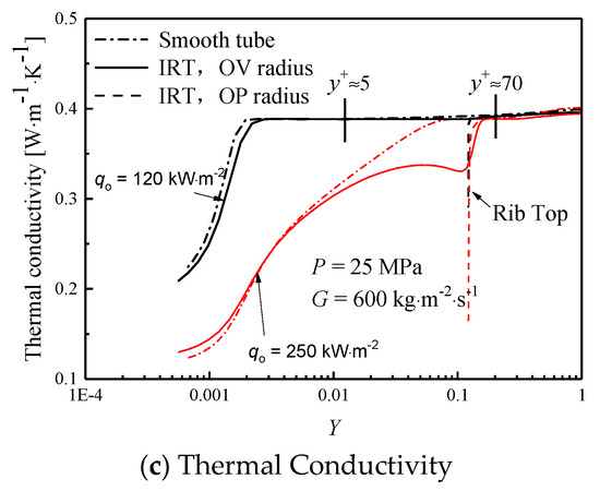 Similarly, as seen in Figure 10b,c, at low heat flux, the density and thermal conductivity of supercritical water in IRT is lower than the corresponding value in ST at the same Y. As the heat flux increases, the density and thermal conductivity of supercritical water is significantly reduced in IRT and ST. The density in ST is smaller than that in IRT at the position where the viscous sublayer is close to the wall (y+ < 5), but in the region of y+ > 5, the density and thermal conductivity in IRT is significantly lower than the corresponding value in ST. At low heat flux, the local inner temperature of the supercritical water in IRT is much higher than that in ST, resulting in a lower density in IRT. However, under high heat flux, the heat transfer deteriorates in ST because the heating wall is covered by a thin layer with high-temperature but low-density fluids, but for IRTs, heat transfer enhancement occurs, where the ribs make the fluid swirling and promote the heavy fluid migrate to the wall, and simultaneously restrict the light fluid (with low density and poor thermal conductivity) toward the center region.
