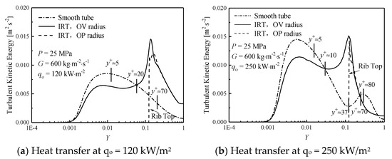 As seen in Figure 11a, in smooth tube, the turbulent kinetic energy increases first and then decreases from the wall to the mainstream region, and a peak appeared in the viscous sublayer (y+ < 5). However, for IRTs, the variation of turbulent kinetic energy profile is complex. Under y+ < 20, the turbulent kinetic energy in IRT is lower than in ST, but in the transition region (5 < y+ < 70), especially in 20 < y+ < 70, the turbulent kinetic energy in IRT is significantly greater than that in ST, and the maximum value appears at the top of ribs. Interestingly, under high heat flux, as shown in Figure 11b, the turbulent kinetic energy on the cross-section of ST reaches a minimum value at y+ ≈ 37, and then recovers, another peak appears at y+ ≈ 80. Additionally, the turbulent kinetic energy of IRT reaches the maximum at the same location (y+ ≈ 37). Known from Figure 9, the corresponding axial velocity V reaches the maximum value in here, where the radial gradient (∂V/∂r) is sharply reduced, resulting in a sharp decrease of the turbulent shear stress. Such special variation of turbulence intensity in the transition region reflects that their heat transfer in such region plays an important role. For IRTs, due to the strong disturbance caused by the ribs, the radial velocity and turbulent kinetic energy in the corresponding position of IRT enhanced and reached the maximum value, so that the minimum value of the turbulent kinetic energy is successfully eliminated that is observed in ST under the condition of high heat flux, which enhances the heat transfer and effectively avoids the occurrence of HTD.