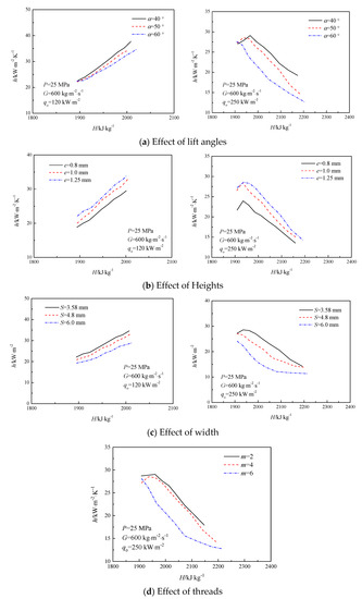 Figure 12. Effects of rib parameters on heat transfer of supercritical water is shown in Figure 11, the comparison of the heat transfer coefficient of the internally ribbed pipe with different rib parameters under the working conditions with pressure of 25 MPa, mass flow rate of 600 kg·m−2·s−1, and heat flux of 120 and 250 kW·m−2.