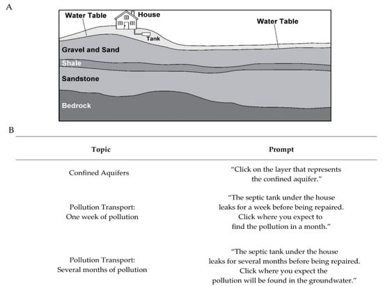 (A) Cross-sectional groundwater diagram used to probe students understanding of confined aquifers and pollution transport and (B) the corresponding prompts for each topic.