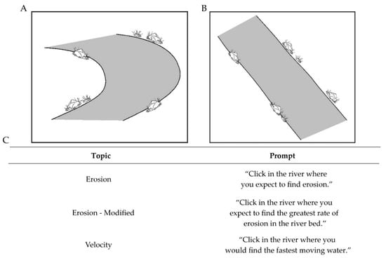 Plan view diagrams of curved (A) and straight (B) river channels used to probe students understanding of erosion and velocity in a river and corresponding prompts (C) for each topic.