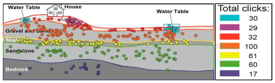 To investigate students’ understanding of groundwater, we probed their interpretation of the term “confined aquifer”. The majority of students clicked the unconfined aquifer (e.g., gravel and sand) and an equal number of students clicked the confined aquifer (e.g., sandstone) and confining layer (e.g., shale). We attribute this distribution of clicks among the main layers in the diagram to students’ lack of knowledge about the term “confined aquifer. The students responded prior to instruction to a question using academic terminology. Many students selected the line labeling the water table. It is possible that these students were unsure of the correct response and relied on signals [28] in the diagram to direct them to important information that they thought would have a higher chance of being correct. During analysis the research team observed that, in addition to the water table labels, this diagram has some confusing or misleading information. Specifically, shale and sandstone are types of bedrock and a more accurate label for the lowest layer would be gneiss, granite, or an equally crystalline basement rock type that is found beneath sedimentary features. Additionally, the presence of the water table, while relevant to the subsequent prompts probing pollution transport, implies that there are distinct layers: one composed of sand and gravel, and one above it that is unlabeled. One reason for this decision was to remove blue color, which could imply a continuous layer of water and perpetuate a common misconception about groundwater [3,13]. Nevertheless, the students’ poor understanding of the term “confined aquifer” does not impede our ability to interpret the results of the pollution transport question.