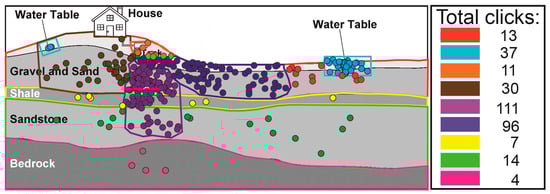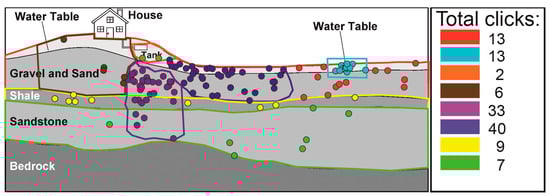 Students were asked to identify the confined aquifer, which is the porous layer of sandstone bounded below by a non-descript layer of “bedrock” and above by an impermeable confining layer of shale. When prompted to identify the location of the confined aquifer, only 15% (n = 60) of students clicked in the correct layer for this question; the sandstone layer is the confined aquifer (Figure 3). A similar percentage selected the confining shale layer (16%, n = 61). Most students click in the unconfined aquifer consisting of the zone of saturation, the sand and gravel layer labeled in orange in Figure 4 (26%, n = 100) and the zone of aeration, the unlabeled region above the water table labeled in red in Figure 4 (8%, n = 32). The other polygons received the rest of the students’ clicks: water table labels (8%, n = 30), tank (7%, n = 29), and bedrock layer (4%, n = 17). There were seven additional clicks (2%) that fell outside of all polygons that we attributed to accidental clicks or students’ not putting effort into answering the questions.