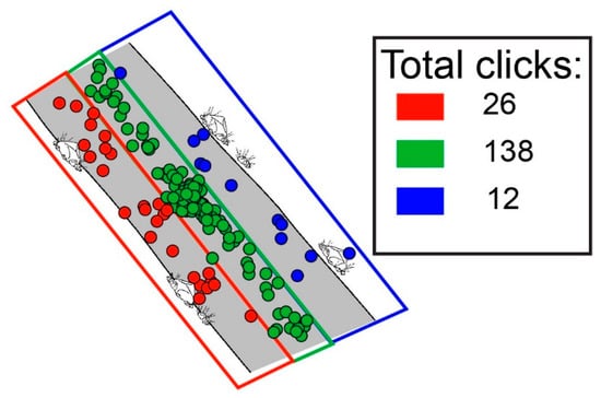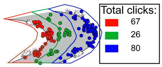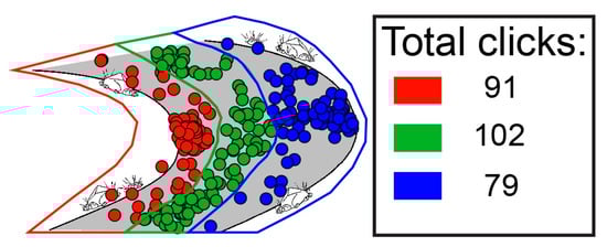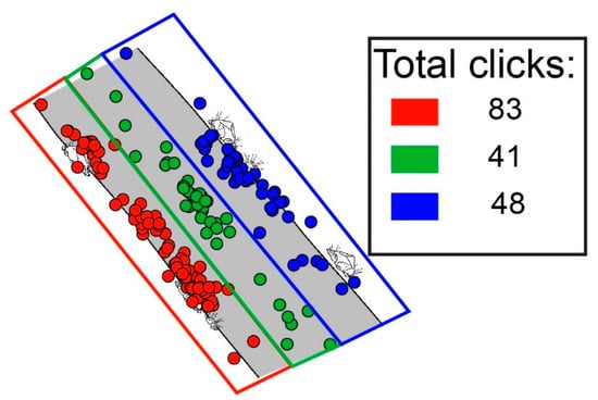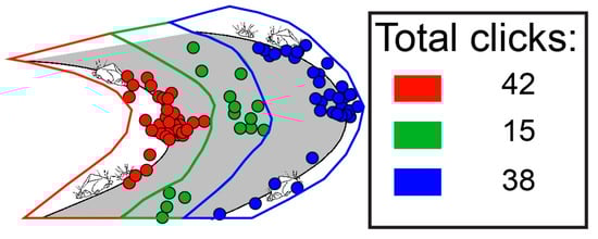 The regions of interest for the straight and curved river channels were constrained first by the shape of the river and second by the density of clicks. The river channel was split into left bank, middle, and right bank polygons, where natural breaks in the click patterns occurred (Figure 6, Figure 7, Figure 8, Figure 9 and Figure 10). To maintain consistency between questions, the same regions of interest (i.e., polygons) were utilized for all of the prompts for a particular diagram.