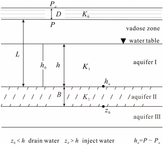 where q is the rate of discharge per unit cross-sectional area (L3T−1), K1, K2 is the saturated hydraulic conductivity of unconfined aquifer I and II respectively (L−1T−1), h is the saturated water level of unconfined aquifer at any time. The pressure in the vadose zone is not equal to the atmospheric pressure; the head is not the height of the water table but (h + ha); hu is the head of the upper plate of the aquifer II; z0 is the constant head. The rate of recharge or discharge per unit cross-sectional area is equal to the injecting or falling rate of surface of saturation multiplied by effective porosity of the coarse sand [2]: