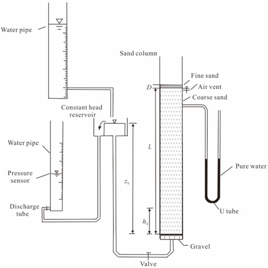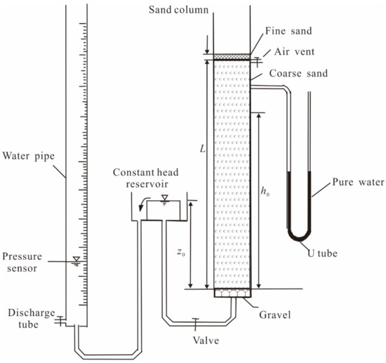 A constant-head reservoir is used to generate the driving force for the water injection and drainage process. The bottom of the reservoir is connected to the bottom of the sand column through a rubber tube. During the water injection experiment (Figure 2), water is injected into the constant-head reservoir through a high-position glass tube, and the water that overflows from the constant-head reservoir flows into another lower-position glass tube. The change of water level can be converted to the volume of water flowing into the sand column through calculation on water level change of the upper and lower glass tubes. During the drainage experiment (Figure 3), the water flowing through the sand column enters the constant-head reservoir and overflows into a scaled glass tube. The water volume that sand column discharges can be measured by the glass tube. The height of the water level of the constant-head reservoir is z0, and the height of the initial water level of the sand column is h0. The relative height between the two is reversed in the water injection experiment (z0 > h0) and the drainage experiment (z0 < h0). In order to capture the rapid changes of water level in the glass tube, a pressure sensor was put into the glass tube to record the water level automatically.
