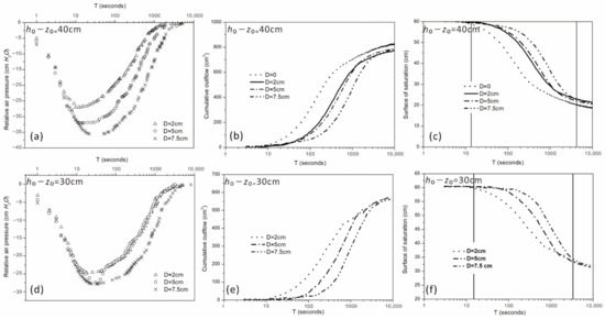 Changes of negative pressure (NP), cumulative outflow, and height of saturation surface with time in drainage experiments. (a) Changes of relative air pressure with time in vadose zone (h0 − z0 = 40 cm). (b) Changes of cumulative outflow with time (h0 − z0 = 40 cm). (c) Changes of calculated height of saturation surface with time (h0 − z0 = 40 cm). (d) Changes of relative air pressure with time in vadose zone (h0 − z0 = 30 cm). (e) Changes of cumulative outflow with time (h0 − z0 = 30 cm). (f) Changes of calculated height of saturation surface with time (h0 − z0 = 30 cm). In (c,f) the vertical lines subdivide the early, middle, and late stages.