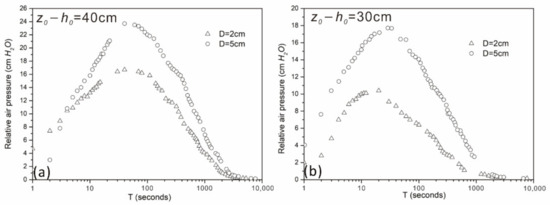 From the two sets of experiments with different initial water head differences (h0 − z0) (Figure 4), it is observed that greater value of (h0 − z0) corresponds to greater NP and slower rate of water level drop, when thickness of fine sand layer is the same. This is because a certain volume of air was expanded in a short time in the vadose zone, but the atmospheric air could not enter in time via the fine sand layer. The greater amount of expanded air was, the greater the peak NP appeared.