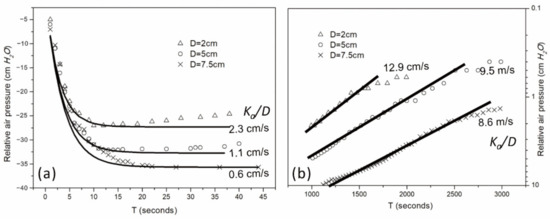 According to Equation (25), the observed data for the drainage time in the range of 1000~3000 s and the analytical resolutions were fitted. The data for the final period (>3000 s) was not used due to the little change and poor accuracy of the U-tube. Based on the experimental results with fine sand thickness of 2 cm, 5 cm, and 7.5 cm, the fitting results for Ka /D are 12.9 cm/s, 9.5 cm/s, and 8.6 m/s respectively (Figure 6b), approximately inversely proportional to the thickness of the fine sand. The corresponding Ka is 26~65 cm2/s, a parameter that reflects breathability of the fine sand layer in the late stage of drainage.