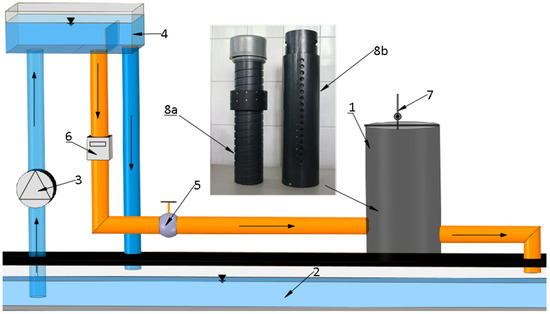 Scheme of the entire test stand: 1—manhole; 2—down tank; 3—pump; 4—upper stability tank; 5—regulating valve; 6—electromagnetic flow meter; 7—precise water gauge staff; 8—rotary regulators of water damming in the drains: 8a funnel, 8b hole.