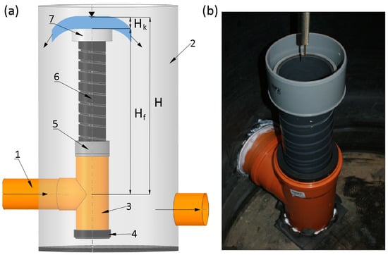 Measurement scheme (a) and photo (b) of the funnel regulator: 1—drain; 2—drainage well; 3—tee; 4—drain plug; 5—stabilising ring (base); 6—threaded stem pipe; 7—funnel overflow; Hf—height of the funnel overflow edge position above the drain axis; Hk—water depth in the shaft pipe axis above the edge of the funnel overflow; H—height of the water level in the shaft pipe in relation to the drain axis.