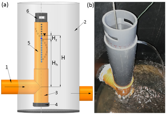 Measurement scheme (a) and photo (b) of a hole regulator: 1—drain; 2—drainage well; 3—tee; 4—drain plug; 5—outer pipe; 6—inner pipe; Hh—height of the open hole above the drain axis; Hz—water depth in the shaft pipe above the opened hole; H—height of the water level in the shaft pipe in relation to the drain axis.