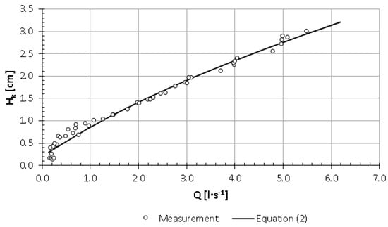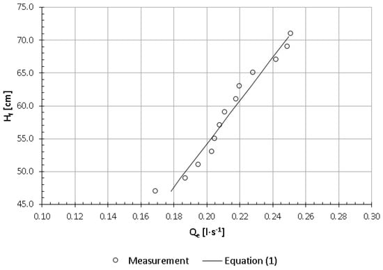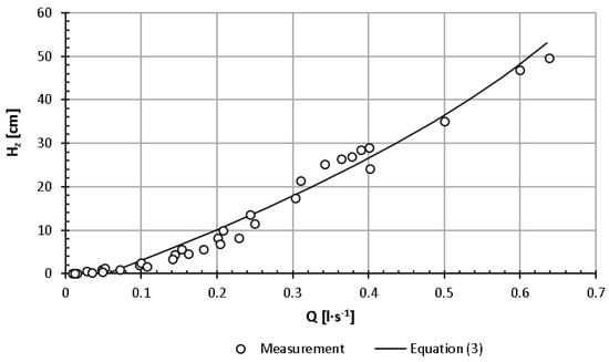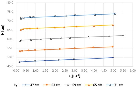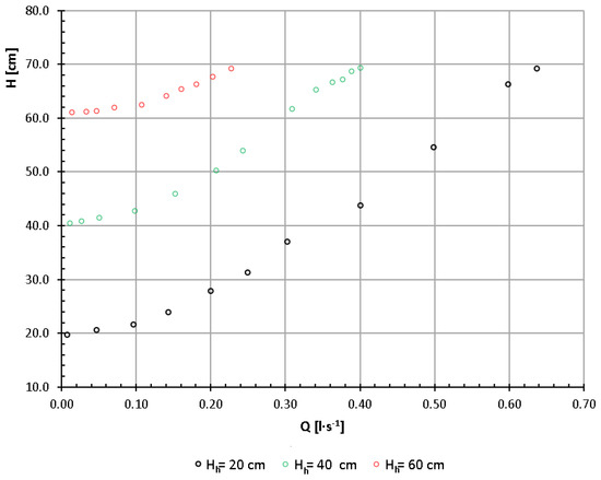 Figure 8 shows the expenditure curves of the tested holes for the water table height Hz, i.e., reduced with respect to the ordinates by the lower edge of each hole. The diagram shows that in the range of small values, i.e., up to 11−15 cm, the expenditures of individual holes are similar and reach the maximum value of Q = 0.25 l·s−1. After exceeding this value, the elevation of the water table above individual holes is characterised by increasing differentiation at the same hole volume. For example, at Q = 0.4 l·s−1, the elevation of the water table above the lower edge of the opening changes from 24 cm to 29 cm high. The reduced curve of the flow rate of the hole regulator openings, developed for intensities of up to Q = 0.65 l·s−1, is presented in Equation (3):