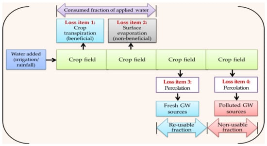 | Percolation from irrigated fields recharges the underlying aquifer in many groundwater basins, including the IGP basin, from where it is recoverable for reuse; so is not a loss. | [54,96,97,98,99,100,101,102] |