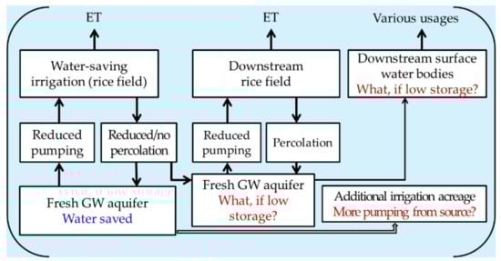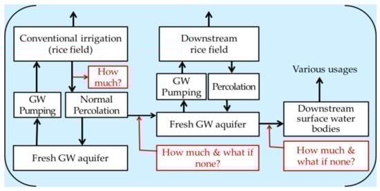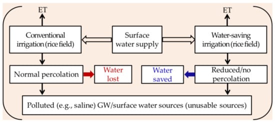 - Anan, M.; Yuge, K.; Nakano, Y.; Saptomo, S.; Haraguchi, T. Quantification of the effect of rice paddy area changes on recharging groundwater. Paddy Water Environ. 2007, 5, 41–47. [Google Scholar] [CrossRef]