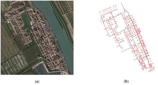 (a) A satellite view and (b) the network layout and user connections of the district metered area of Gorino Ferrarese (FE-Italy).