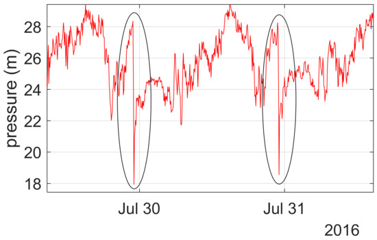 Trends in the pressure with a 5 min time step over two days highlighting the operation of pressure reduction through two ellipses.
