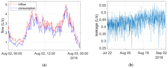 (a) District metered area (DMA) inflow (red) and the sum of all the users’ water consumption (blue) with a 5 min time step over one day. (b) Trends in the leakage with a 60 min time step over the period of 45 days.