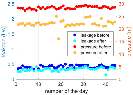 Values of pressure before (red) and after (orange) the pressure reduction maneuver and values of leakage before (blue) and after (light blue) the same maneuver, which were extrapolated from the hourly time series for each of the 45 days of monitoring indicated on the x axis.