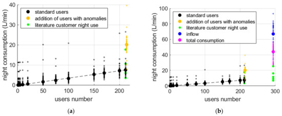 With reference to the results of the application of the MNF method in general and the estimation of the minimum night consumption in particular, in Figure 6a, the small, empty black dots represent the minimum night consumption for set 1 (i.e., residential users without anomalies, such as leakages within their houses or night irrigation) observed on each monitored day according to the dimensions of the clusters composed of the residential users. In addition, for each cluster, the average value over the 45 days is plotted with a bigger full black dot. As expected, these values increase with a corresponding increase in the number of users, as highlighted by the interpolating straight line evaluated with the least squares method. Regarding the largest cluster (i.e., composed of all the 212 residential users without anomalies), the minimum consumption provided in the scientific literature is plotted with green dots in Figure 6a, and it can be noticed that almost all of them are a good approximation of both the real minimum night consumption values observed on each day (empty dots) and their mean value (full black dot) for the 212 users. Indeed, a larger value was obtained by considering only the minimum night consumption value provided in the scientific literature for Malaysian users [20].