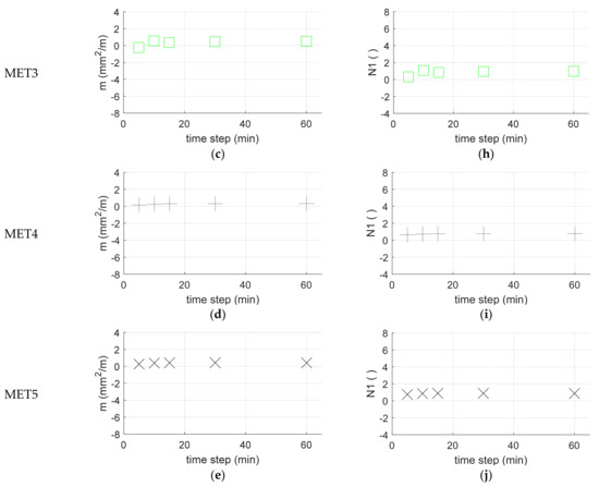 (a–e) Values of the coefficient m plotted as a function of the time step estimated with the different methods: MET1–MET5. (f–j) Values of the coefficient N1 plotted as a function of the time step estimated with the same methods.