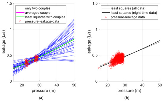 The aforementioned differences between considering one pair (or several pairs) of data observed only before and after a maneuver and the entire time series of pressure and the corresponding leakages are also highlighted in Figure 8, where the FAVAD equations with coefficients estimated by using the different methods are plotted. As can be observed, the FAVAD equations whose parameters are estimated by using only pairs of data can lead to quite unreliable estimations of the effects of pressure variation on leakage, whereas the FAVAD equations whose parameters are estimated by using the entire time series of pressure and leakages lead to a more consistent estimation.