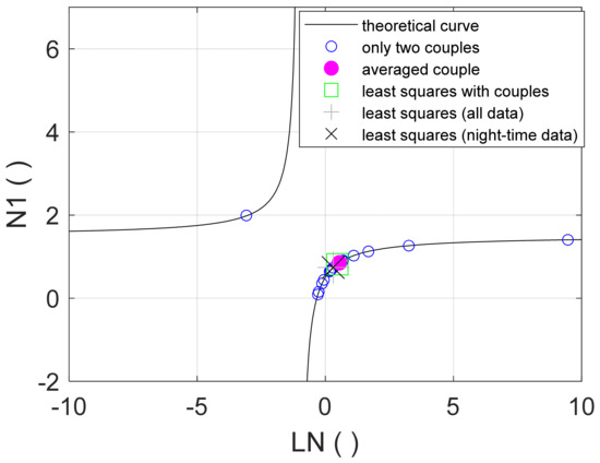 However, it can be noticed that the points assessed with methods MET2–MET5, that is, by using all of the pairs or the time series, are in a small range and are in a physically valid region, while the 45 pairs of N1 and LN values from method MET1 are scattered all over the theoretical curve up to the limit values, such as negative LN, which correspond to a negative m or A0, which do not have a physical meaning in network systems like the one considered here.