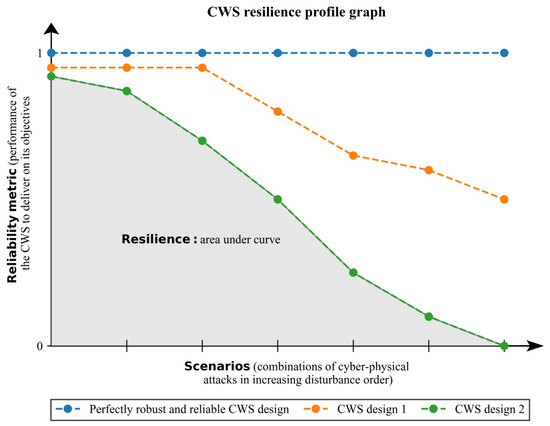 To adapt the methodology for the CPS system’s CWS performance under cyber-physical attacks, we use a resilience profile graph as shown in Figure 1. The figure demonstrates the performance of an ideal, perfectly robust, reliable, and resilient CWS design, as well as two others with different properties. In this example, CWS design 1 is more resilient than CWS design 2, as communicated by the respective areas under their reliability curves. CWS design 1 retains higher reliability with the progressive increase in stress from the scenarios, whereas CWS design 2 rapidly loses performance as stress increases. The scenarios represent combinations of cyber-physical attacks that hinder the CWS’s ability to detect contamination while the WDN water is deemed unsafe for consumption. The CWS designs refer to different topologies of placed sensors (different total number and locations monitored) and sets of controls for response and mitigation measures. The reliability metric could be any metric that can describe the CWS performance and the impact on the WDN in a systematic way, such as the detection rate of contamination events.