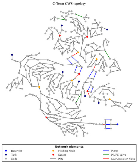 Example of CWS topology for C-Town with a sensor design of five sensors.