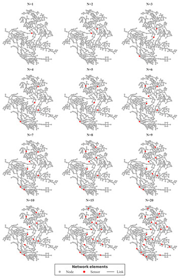 As the associated set of controls included the isolation of DMAs to minimize the spread of contamination, the rational choice of objective function in placement optimization in TEVA-SPOT was minimization of the mean contamination extent. We generated 12 sensor designs of size , as seen in Table 1 with the sensor names and their rankings, by employing 388 (i.e., for all junctions) injection scenarios. The spatial representation is depicted in Figure 3. Designs of size were selected to explore a progressive increase in sensor number, and to explore designs with a relatively high-monitored locations-to-total nodes ratio (roughly 3.8% and 5.1% respectively).