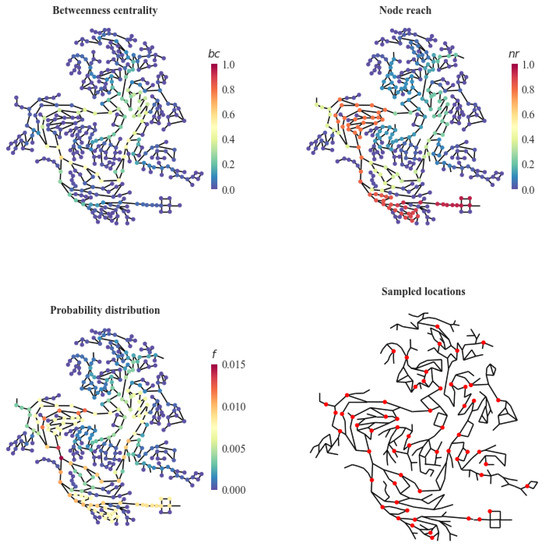 Betweenness centrality, node reach, probability distribution of sampling choice, and the final sampled locations with .