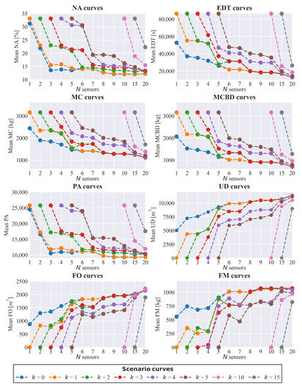 The 58 physical attacks were applied to 12 sensor designs with 7 scenarios of cyber-attacks, as described in Table 2, and also accounting for baseline normal operation of the system, and produced a total of 2900 cyber-physical simulations within a total computational budget of roughly 24 h. Figure 5 shows metric curves that aggregate the results with descriptive metrics. Each curve refers to a scenario set with attacked sensors with points of the curve describing the mean impact of the scenario set (y-axis) to the topology of sensors (x-axis).