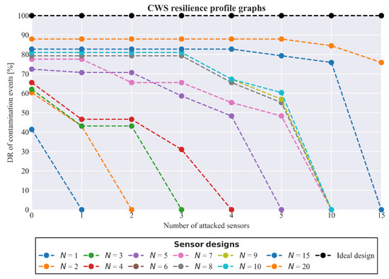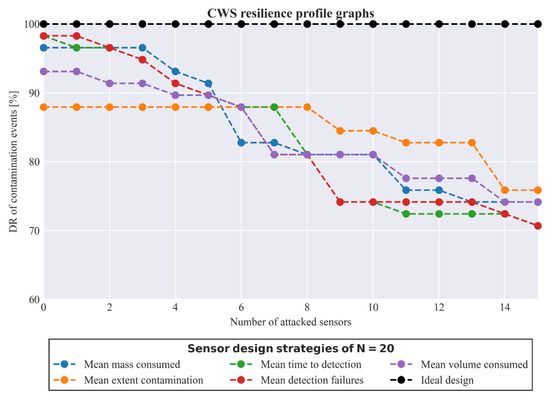 Examining the metrics presented in Figure 5 allows us to fully describe the system’s behavior under cyber-physical attacks and thus under failure in a variety of scenarios. In addition, we need a well-defined, straightforward, and comprehensible way to measure the reliability of the system to generate resilience profile graphs. Thus, we used the detection rate of the contamination events metric, , as a surrogate for reliability. The resilience profile graphs for each sensor design are presented in Figure 6. It is evident that sensor designs and were the most resilient and robust. Notably, the resilience score for and this particular ordinal set of disturbances was 85.99%, signifying that even under failure it retains most of its ability to detect contamination in most cases, even when this means lower performance in most other metrics. On the contrary, the sensor design, which seems the best trade-off between performance and cost in normal operation, under these disturbances (some of which, i.e., were well beyond its design capacity) had a much lower resilience score of 48.70%. Even scaled within its design capacity for up to , the resilience score was 64.90% owing to its much lower normal operation reliability and greater susceptibility due to the lower count of sensors. In addition, seeming like a paradox, pairs and attained better reliability (detection rate) than and , but the actual design goal was to place sensors to minimize the mean extent of contamination, and this was a surprising side-effect. The remaining working sensors in happened to fare in detection rates better than the complete sets of sensors in and , as these were be placed in less central locations (due to their lower ranking) and thus, monitor more locations, increasing network coverage. It should also be noted that designs and had exactly the same resilience results. This was to be expected, as these designs had the same sensors, except the lowest ranked sensor in (placed at J179), which was placed at a position monitoring locations that were a subset of locations monitored by the sixth sensor (placed at J297) in both designs. The resilience scores are presented in Table 3.