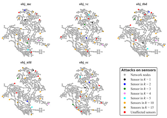 The behavior of the topology generated by optimizing the placement with the objective function mean contamination extent () exhibited, as expected, better performance than other topologies with a lower number of sensors, but also showed robustness and resilience traits. This brings up the question of whether using other topologies comparable in the number of sensors would fortify the network with better performance under loss of function due to cyber-physical attacks. Using TEVA-SPOT, four more topologies of 20 sensors were generated using the objective functions (i) minimize mean mass consumed, , (ii) minimize mean volume consumed, , (iii) minimize mean time before detection, , and (iv) minimize mean number of failed detections, . The sensors selected for each objective function are shown in Table 4. The same selecting methodology of best ranked sensors for cyber-attacks and the same injection location set were used to compare performance. For better comparison purposes we used all sets for . Figure 7 depicts the sensors’ locations in the network, color coded by sets of attacks.