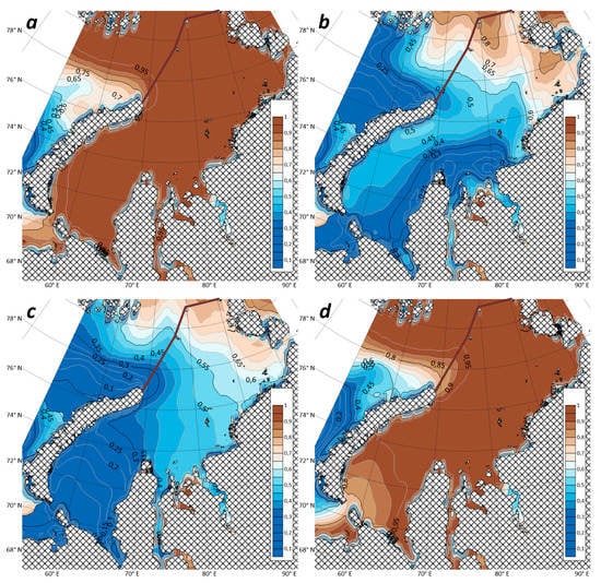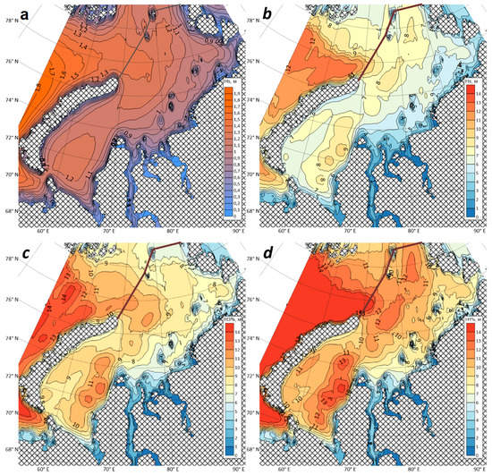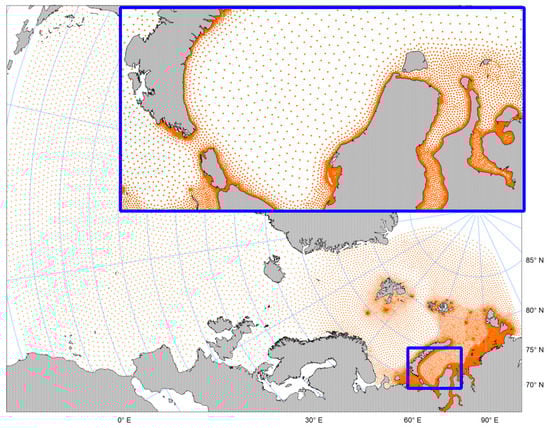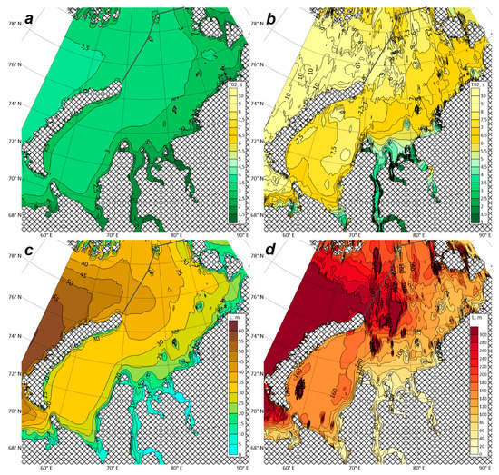 - Diansky, N.; Fomin, V.; Kabatchenko, I.; Gruzinov, V. Simulation of circulation of the Kara and Pechora Seas through the system of express diagnosis and prognosis of marine dynamics. Arct. Ecol. Econom. 2014, 1, 57–73. [Google Scholar]