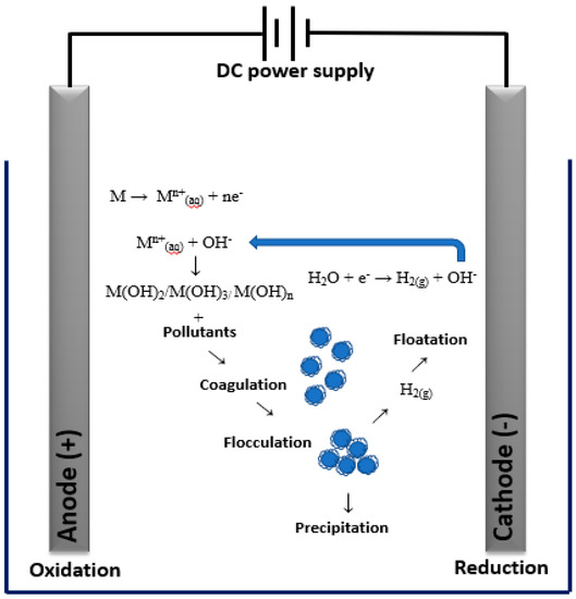 Figure 1 illustrates the general mechanisms that occur during the EC process involving electro-generation of coagulants, coagulation, flocculation, precipitation, and/or flotation [26,32]: