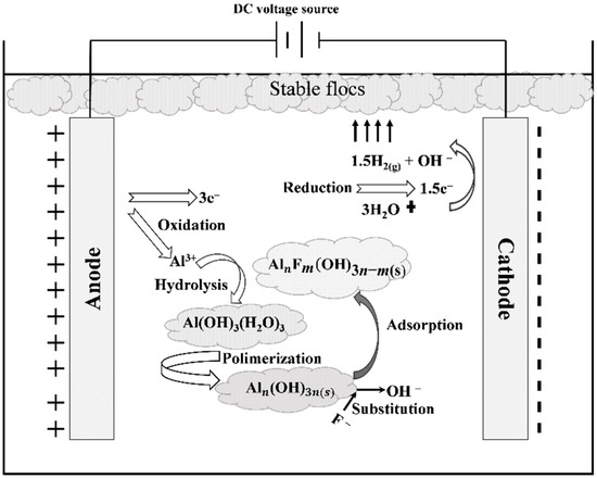 The EC process is considered as an advanced technology, associating three conventional water treatment pieces of knowledge, including electrochemistry, coagulation, and flotation [28,29]. This process is applicable for remediation of the industrial effluents and groundwater, eliminating various pollutants before discharging or reusing the treated water. EC operation is conducted in electrolytic reactors consisting of at least two electrodes, which allow the current circulation through the external power supply. It is essential to highlight that the electrode surface serves to interexchange electrons with electroactive species in solution. The electro-dissolution of the sacrificial anode and the water reduction at the cathode yield coagulants species, which remove pollutants by forming large flocs that can be physically separated from water [29]. Coagulation and flocculation appear in consecutive steps, permitting particle collision and growth of floc. Coagulation results from the lessening of electrostatic repulsive forces, consequently, the negative charges (F−) are neutralized. Then, the suspended microscopic particles can stick together (not visible). Flocculation, a gentle mixing stage, helps to increase the size of the suspended particles into larger flocs (visible).
