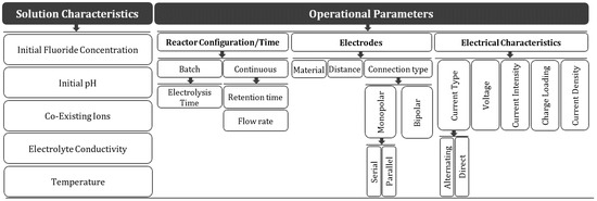 According to several studies on fluoride removal via the EC process, various parameters affect the removal efficiency. As a holistic approach, the affecting parameters are classified into two major categories: (i) physicochemical solution characteristics and (ii) operational parameters related to reactor design. All operational parameters and solution characteristics given in Figure 4 might influence the EC process performance. A summary of some evaluated factors and conditions with defluoridation performance using EC system is presented in Table 5.