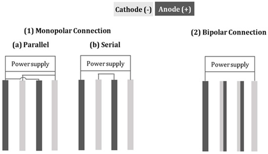 Various connection types of electrodes to the power supply in an electrocoagulation process.