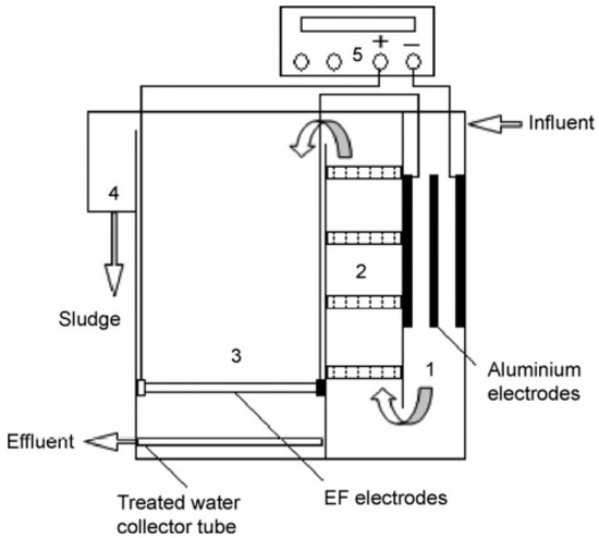 Batch reactors treat a defined volume of solution that does not change over time. In a complete mixed batch reactor, the reaction rate of a constant volume of solution varies with time; so, the electrolysis time is crucial in a batch EC process [81]. An augmented fluoride removal efficiency is generally observed when increasing electrolysis time due to the sufficient production of aluminium coagulants according to Faraday’s Law (Equation (22)) [70].