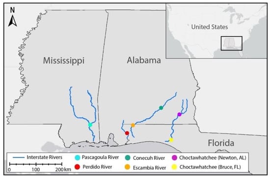 Location map with inset of study location within the overall United States (small black rectangle) and the six United States Geological Survey (USGS) streamflow gages used within the study between the states of Mississippi, Alabama and Florida.