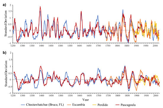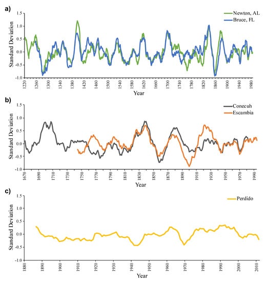 All five streamflow gages demonstrate comparable patterns in their reconstructions, indicating a common climatic pattern in the AL-FL region (Figure 2a–c and Figure 3). At all four gages reconstructed to the early 1800s, a notable pluvial event was observed in the reconstruction ca. 1830 CE, followed shortly after by a severe drought in the mid-1800s. All five reconstructions end prior to the end of the observed records and cannot be compared to more recently observed data without bias correction [64]. Therefore, the initial streamflow reconstruction values were bias-corrected. The bias-corrected data for the downstream gages along the rivers located in Florida (Choctawhatchee at Bruce, Escambia, and Perdido) were then standardized such that they could be compared against each other (Figure 3; [63]).