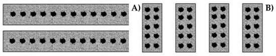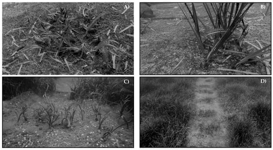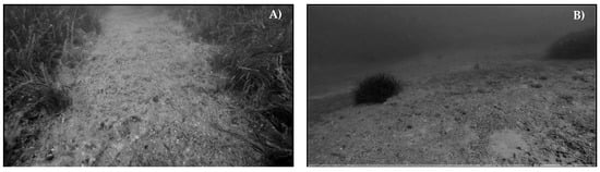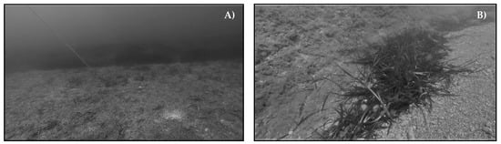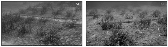 In both efforts, strips of the mat from 10 m2 to 25 m2 in size were employed. In the Capo Carbonara MPA, Macmat® R (Maccaferri, Bologna, Italy) geomats were used, a reinforced geomat obtained by a three-dimensional polymer matrix extruded onto a double twisted steel woven mesh (Figure 3A). The use of Macmat® R to restore P. oceanica dead matte has been explored by a pilot transplanting project that provided promising results [36,37]. Conversely, in the Elba Island degradable mats made of natural coconut meshes coupled with a double twisted steel woven mesh R.E.C.S.® (Figure 3B) were employed. Both mats have a mesh size of 8 × 10 cm and a thickness of about 5 cm. The mats were anchored by metal pickets 120 cm long to the dead matte at a depth of 15–20 m (with a mean of 1 picket per m2). In both efforts, drifting P. oceanica cuttings naturally uprooted were collected on the surrounding bottoms by SCUBA scientific divers. At Capo Carbonara, the cuttings were harvested in natural storage sites characterized by sand bottom clearing areas within the extensive meadow where the restoration was set up (Figure 4A). At Elba Island, natural storage sites occurred in small bays adjacent to the transplanting site (Figure 4B). The exposition to storms of both transplanting sites was crucial to determine the availability of cuttings. The cuttings to be used as transplanting material were selected on the basis of their size, number of shoots, and health conditions visually estimated. Where necessary, cuttings were split to obtain the required size. For both efforts, one cutting consists of a fragment of the rhizome of about 20 cm bearing 1–3 shoots. At Elba Island, 300 P. oceanica seedlings collected in accumulation areas along the coast or found on the surrounding bottoms by SCUBA scientific divers, were also used. Both shoots and seedlings were anchored to the substrate through manual inclusion in the mats previously fixed to the bottom (Figure 5). At Capo Carbonara, 40 mats of 25 m2 were positioned, for a total surface of 1000 m2 of transplanting area; twelve plots (with 30 plant cuttings each) were placed on each mat for a total of 480 plots (Figure 6A and Figure 7A,B). At Elba Island 10 mats of 10 m2 each were positioned, for a total surface of 100 m2; ten plots (with 20 plant cuttings each) were placed on each mat for a total of 100 plots (Figure 6B and Figure 8A). Moreover, one mat was used exclusively for seedlings (Figure 9). Within each plot, cuttings were positioned about 8 cm from each other; the centers of plots were distant about 1 m from each other. Seedlings were positioned about 5 cm distance between them.