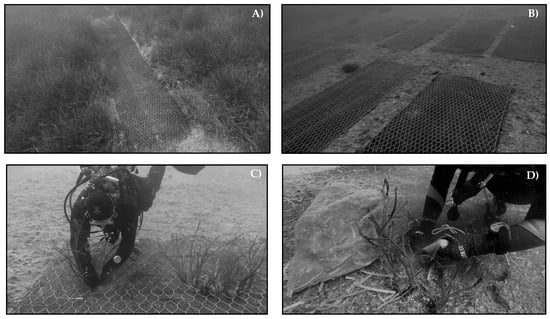 Mats positioned on the bottom at Capo Carbonara (A) and at Elba Island (B) and manual inclusion of cuttings in the mat (C,D).